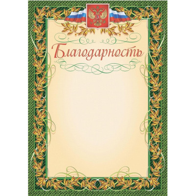 Благодарность (с гербом и флагом, рамка лавровый лист) (уп. 40 шт) КЖ-158уп
