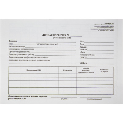 Бланк Карточка учета выдачи СИЗ, А5 офсет 50шт/упак 1205160