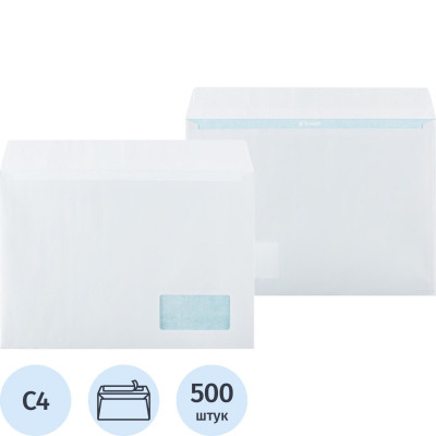 Конверт белый С4 стрип 229х324 90г прав.окно КОМУС 500 шт/уп