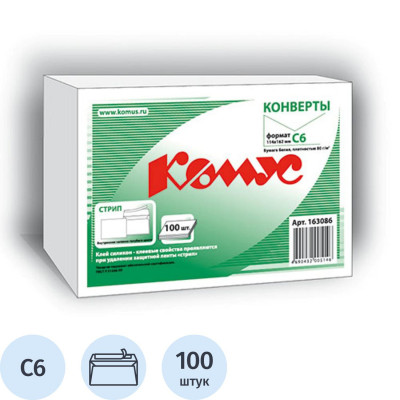 Конверт белый С6 стрип 114х162 80г КОМУС 100шт/уп 12уп/кор