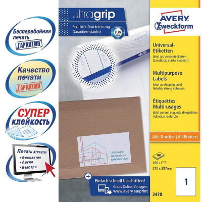 Этикетки самоклеящиеся 3478 универсал. 210х297мм,IJ+L+K+CL,100шт/уп