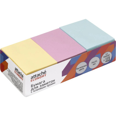 Бумага для заметок с клеевым краем Economy 76x51 мм, 100 л, цв в асс, 12 бл