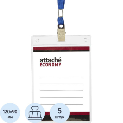 Бейдж Attache Economy 108x126 150мкм,шнур.2заж 45см син,вклад.90x120 5шт/уп