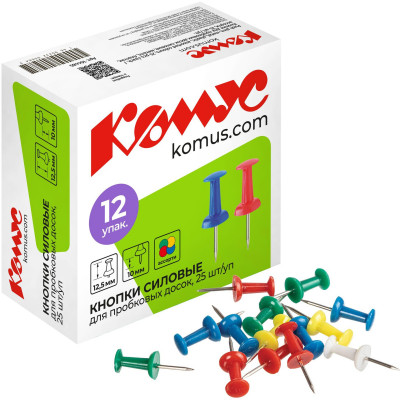 Кнопки силовые д/пробковых досок Комус,пластик.шляпка,ассорти,европ,25шт/уп