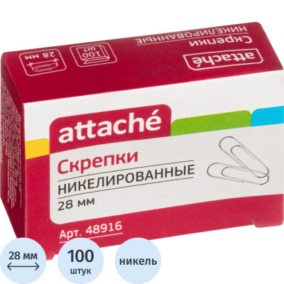 Скрепки Attache никелированные, 28 мм, негофрированные, 100 шт/уп
