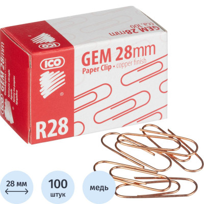 Скрепки ICO омедненные, 28 мм, негофрированные, золотистые, 100 шт/уп