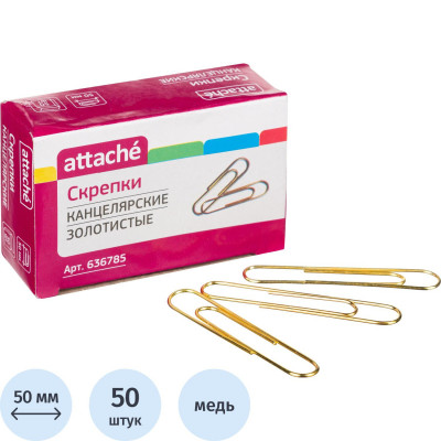 Скрепки Attache омедненные, 50 мм,негофрированные, золотистые, 50 шт/уп