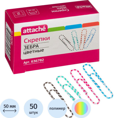 Скрепки Attache Зебра с полимерным покрытием,50 мм,разноцветные,50 шт/уп