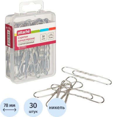 Скрепки Attache никелированные, 78 мм, гофрированные,европодвес, 30 шт/уп