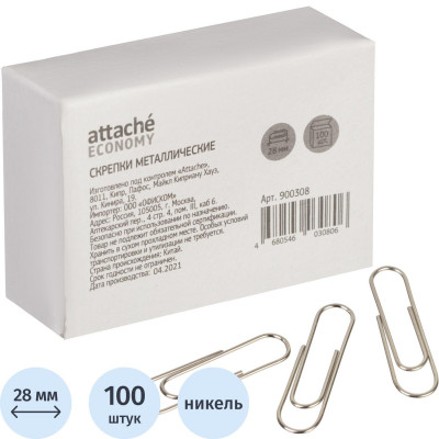 Скрепки Attache Economy никелированные, 28 мм, негофрированные, 100 шт/уп