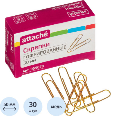 Скрепки Attache омедненные, 50 мм, гофрированные, золотистые, 30 шт/уп