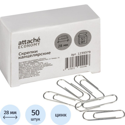 Скрепки Attache Economy оцинкованные, 28 мм, негофрированные, 50 шт/уп