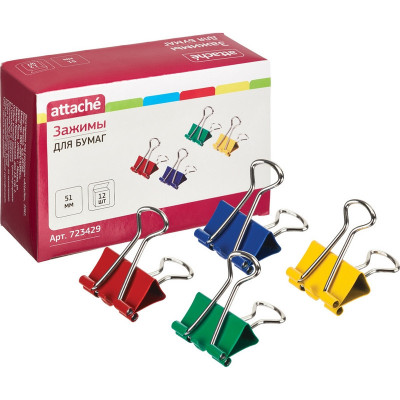 Зажимы для бумаг Attache, 51 мм, 12 шт., цветные, в карт.коробке
