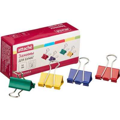 Зажимы для бумаг Attache, 32 мм, 12 шт., цветные, в карт.коробке