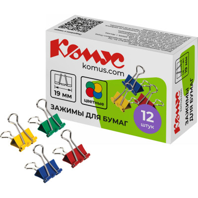 Зажимы для бумаг 19мм 12шт./уп. Комус цветные, картон