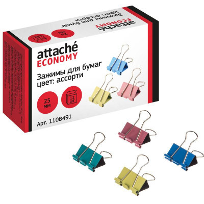 Зажимы для бумаг 25мм 12шт/уп Attache Economy, цветные, в карт.коробке