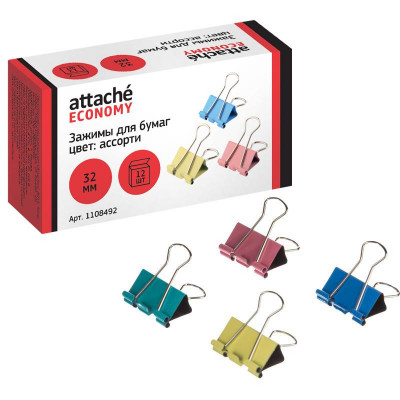 Зажимы для бумаг 32мм 12шт/уп Attache Economy, цветные, в карт.коробке