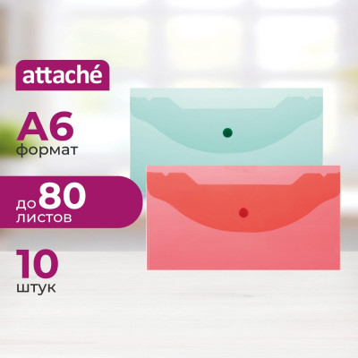 Папка-конверт на кнопке А6 135x250мм,Attache 180мкм, ассорти, 10шт.уп