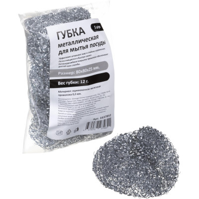 Губка-мочалка металлическая для мытья посуды 80x80x25мм 12г 5шт/уп