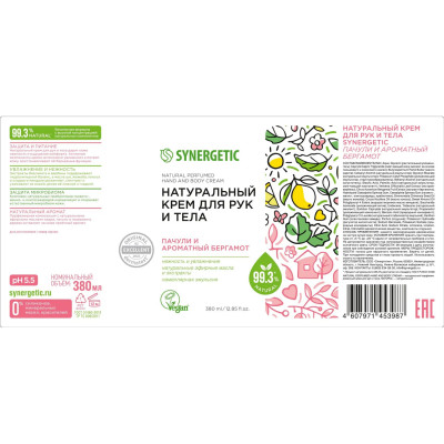 Крем для рук и тела SYNERGETIC Пачули и ароматный бергамот 380 мл