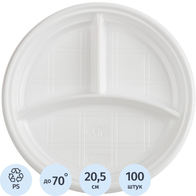 Тарелка одноразовая d-205мм, 3-х секционная белая, ПС 100шт/уп