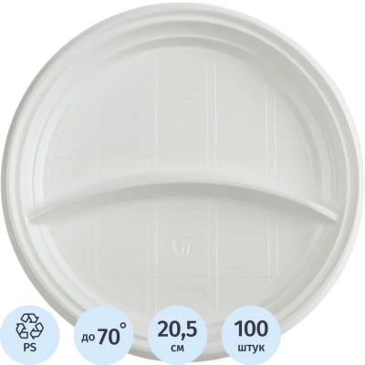 Тарелка одноразовая d-205мм, 2-х секционная белая, ПС 100шт/уп