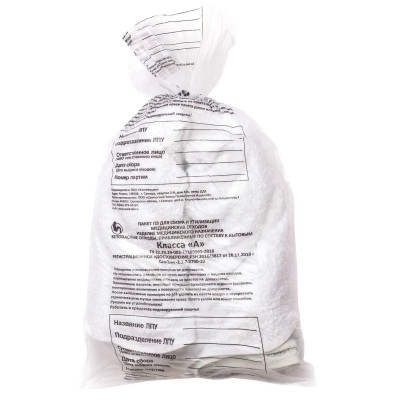 Пакет для мед.отходов кл.А белый 600х1000х18мкм,100л, 100 шт/уп, ПТП Киль