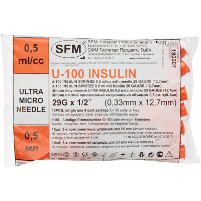 Шприц инсулиновый U-100 0,5мл 29G(0,33x12,7) инт. 10ш/уп SFM