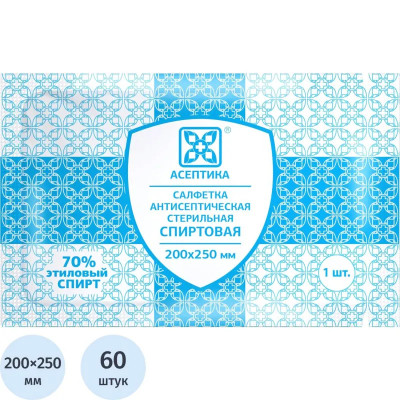 Салфетка спиртовая, антисептическая, этил. сп. 200х250мм АСЕПТИКА 60шт/уп