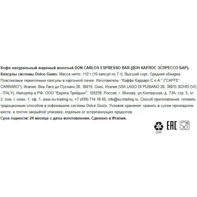 Кофе в капсулах Don Carlos Espresso Bar (DG), 16шт/уп
