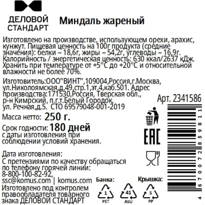 Миндаль жареный Деловой стандарт, 50г СПБ