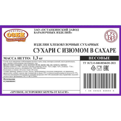 Сухари Семейка ОЗБИ с изюмом в сахаре, 2кг/уп 1273
