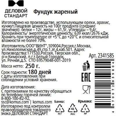 Фундук Деловой Стандарт жареный в банке, 250г СПБ