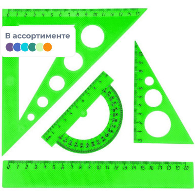 Набор средний: линейка 20см, угольники 16см и 10см, трансп-р 10см,цветасс.
