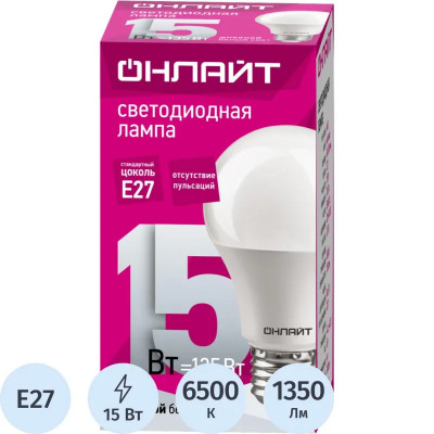 Лампа светодиодная ОНЛАЙТ OLL-A60-15-230-6.5K-E27 15Вт Е27 6500К 61151