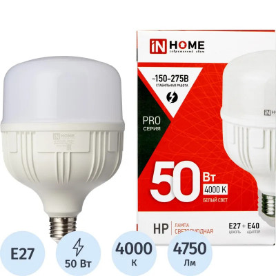 Лампа светодиодная LED-HP-PRO 50Вт 230В Е27 с адаптером E40 4000К IN HOME
