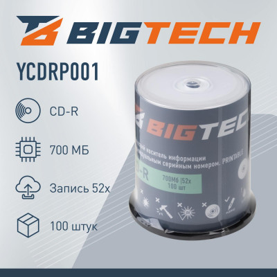 Носители информации Bigtech YCDRP001 CD-R 700МБ Printable 52x 100шт/уп cake