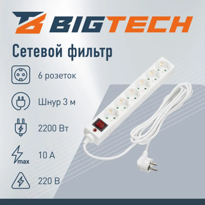 Сетевой фильтр BigTech CD6-3W1 (6р/3м/10А/2500Вт 1мм 2500Вт)