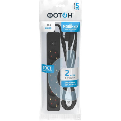 Удлинитель ФОТОН 16-25ЕS, 2м, 5 розеток, 16А, с выкл., с заземл., Черный
