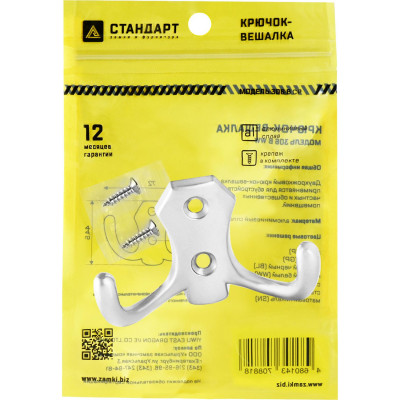 Вешалка настенная УЗК_Крючок двухрожковый СТАНДАРТ 306 B CP (15837),хром